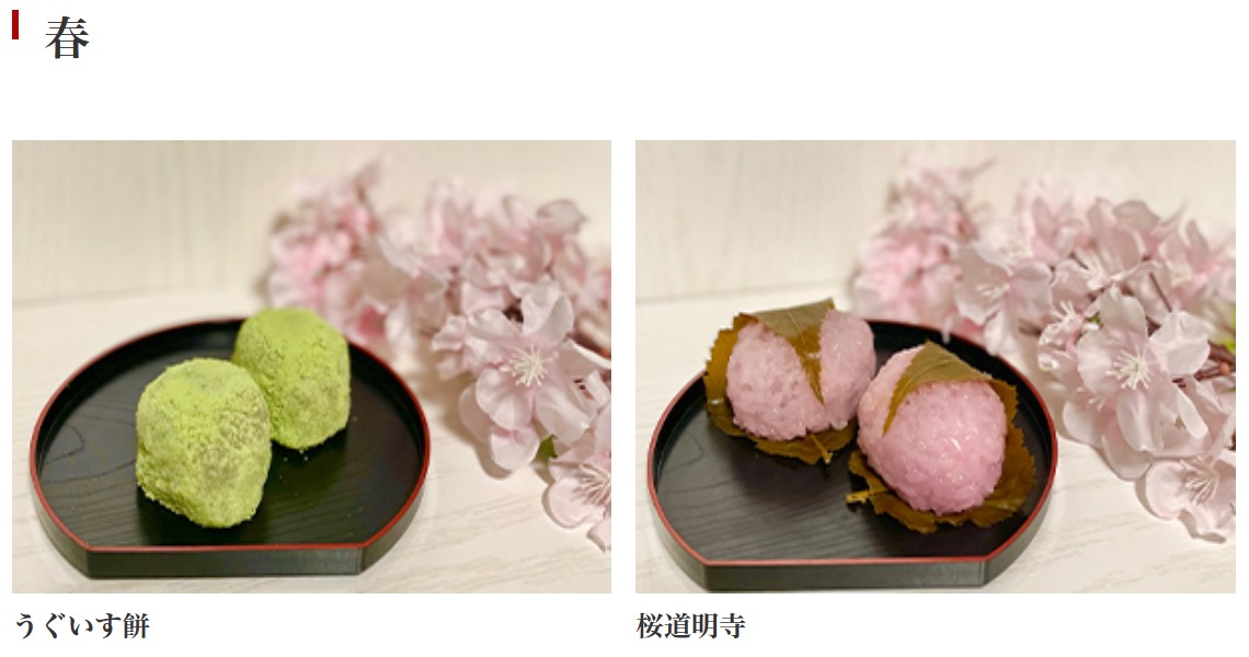 季節の商品は、春には色鮮やかなうぐいす餅や桜餅など取り揃え、夏は水大福、冬にはいちご大福など四季折々の和菓子が用意されている。