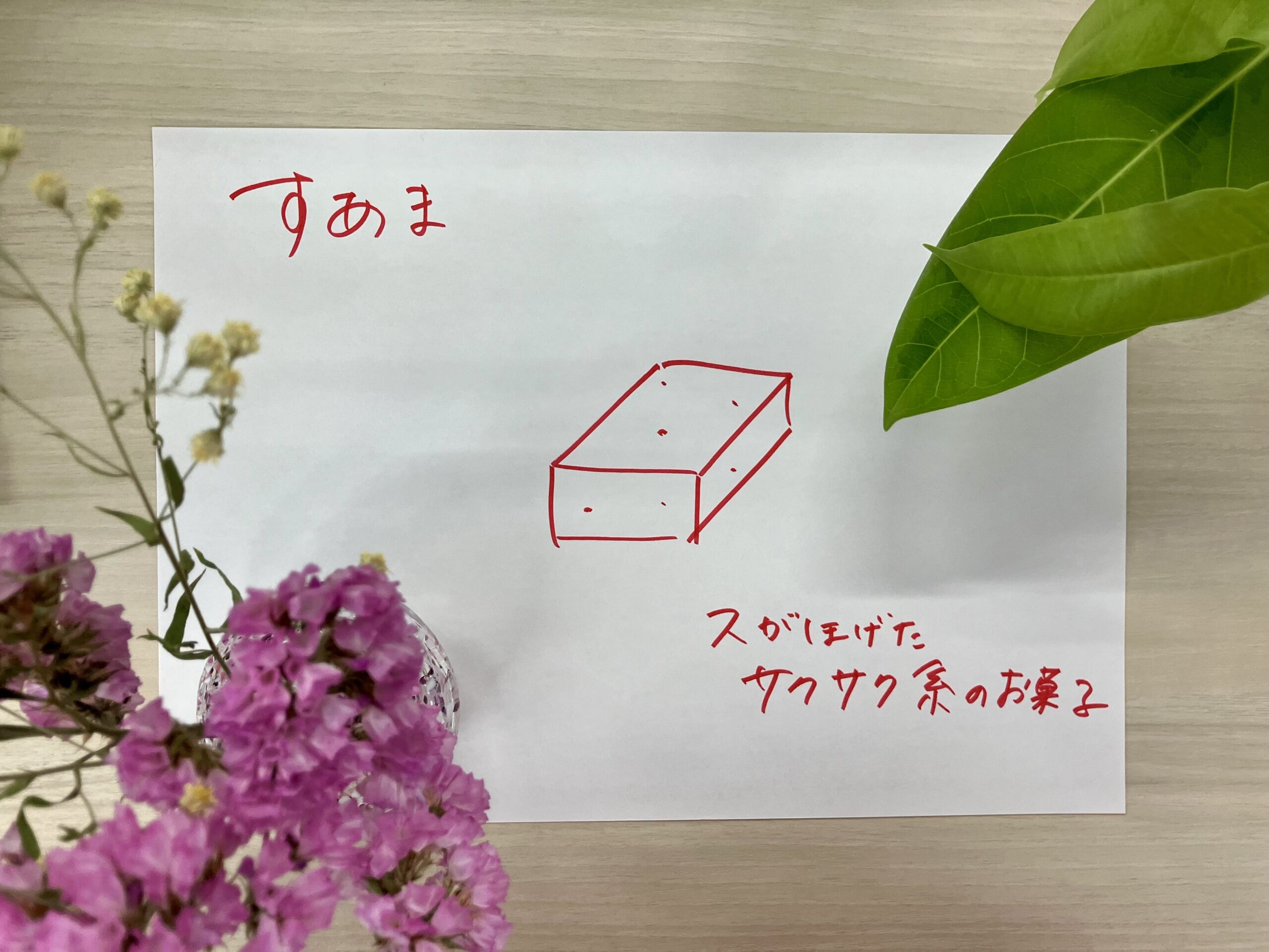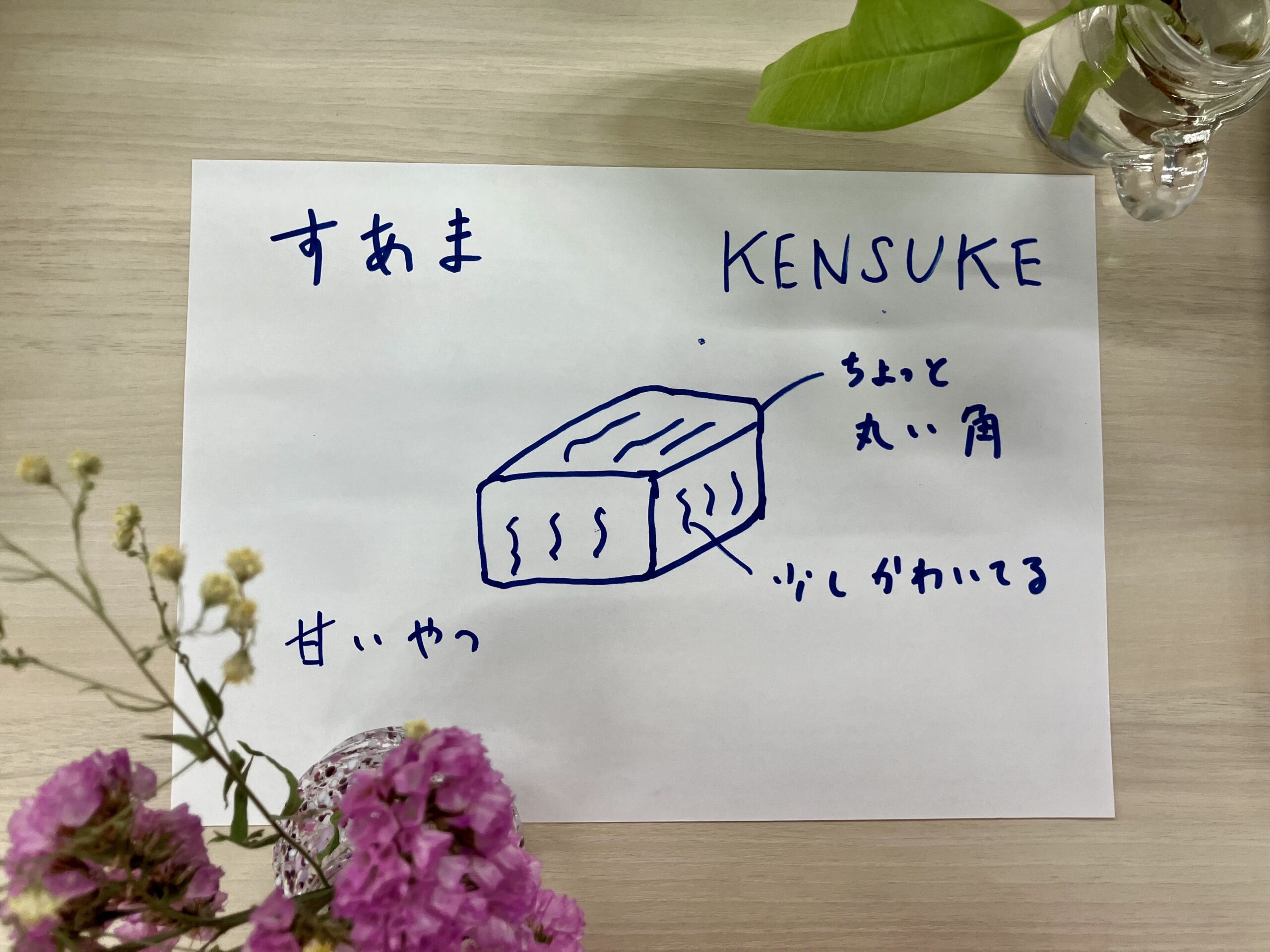 商品名からどんな素材、形状、食感のお菓子なのかを想像し、イラストにおこしコメントを述べること。
