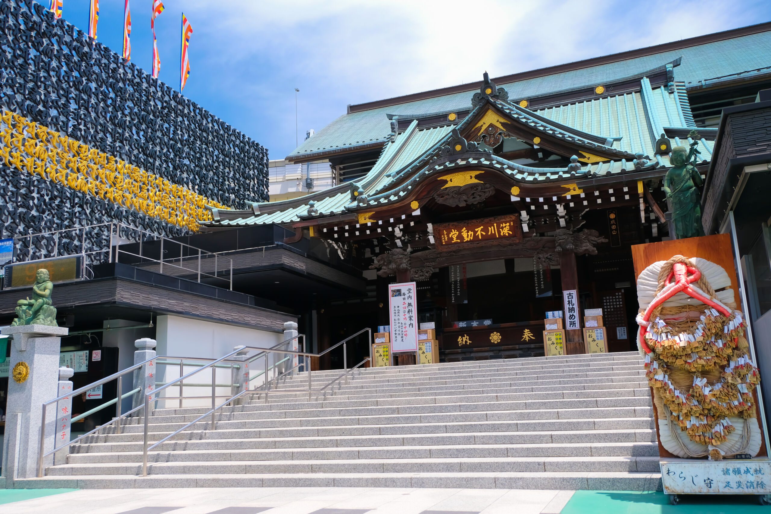 深川不動堂は、初詣では300万人以上の人が訪れるといわれる千葉県成田市にある「大本山成田山新勝寺」の東京別院。本堂では毎日2時間ごとに5回、9時から17時まで(正月、毎月1、 15、 28日の縁日は19時まで)30分間護摩祈祷が行われ、誰でも気軽に参列できる。